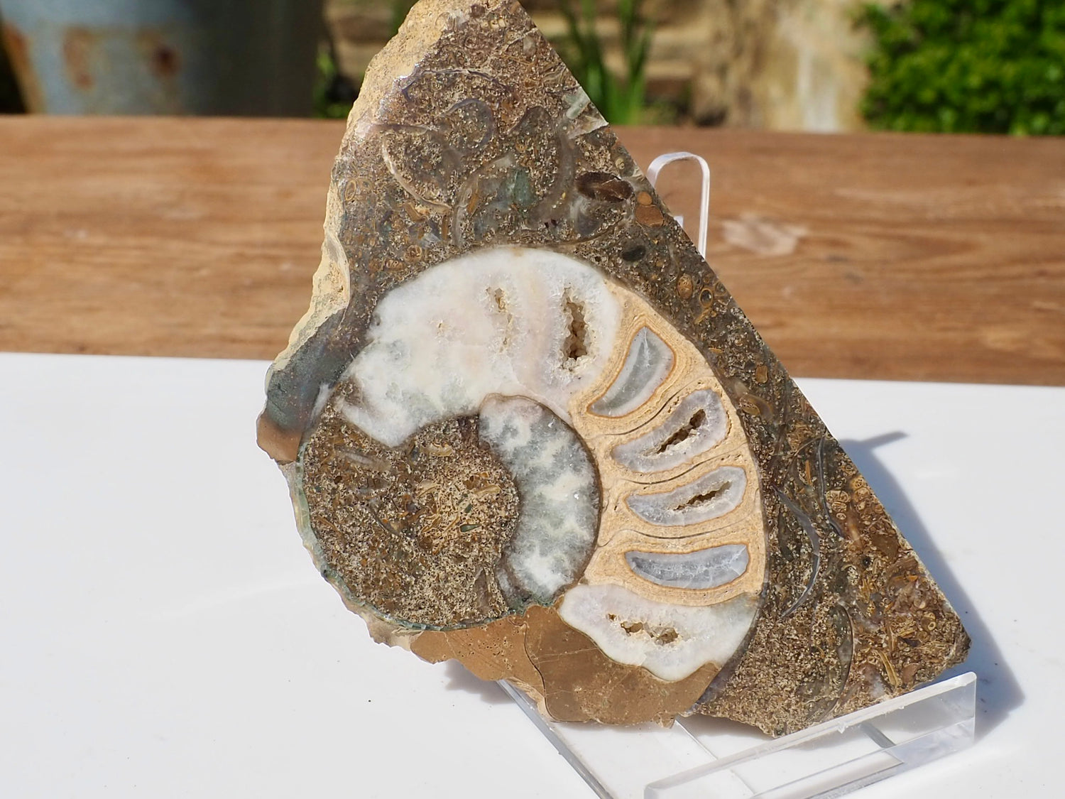 A stunning cut and polished ammonite available for sale. Available with a Cutbase