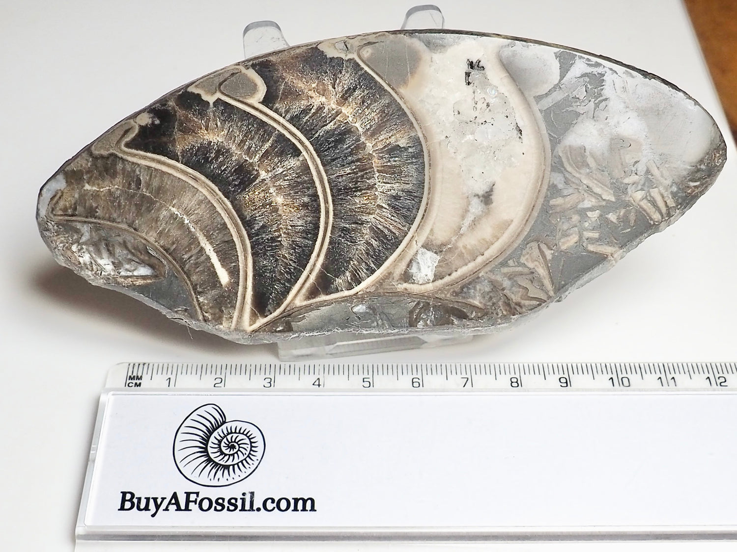 A stunning cut and polished ammonite whorl available for sale.