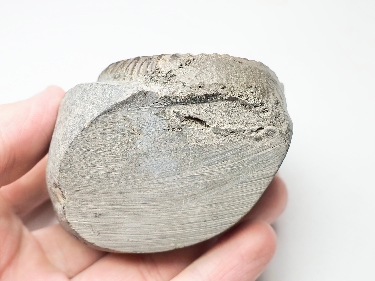 The ammonite shown in the pictures is the exact one you will receive. It looks brilliant on display. It comes with a lovely cutbase. Slight restoration on the edge of the ammonite, near the base.