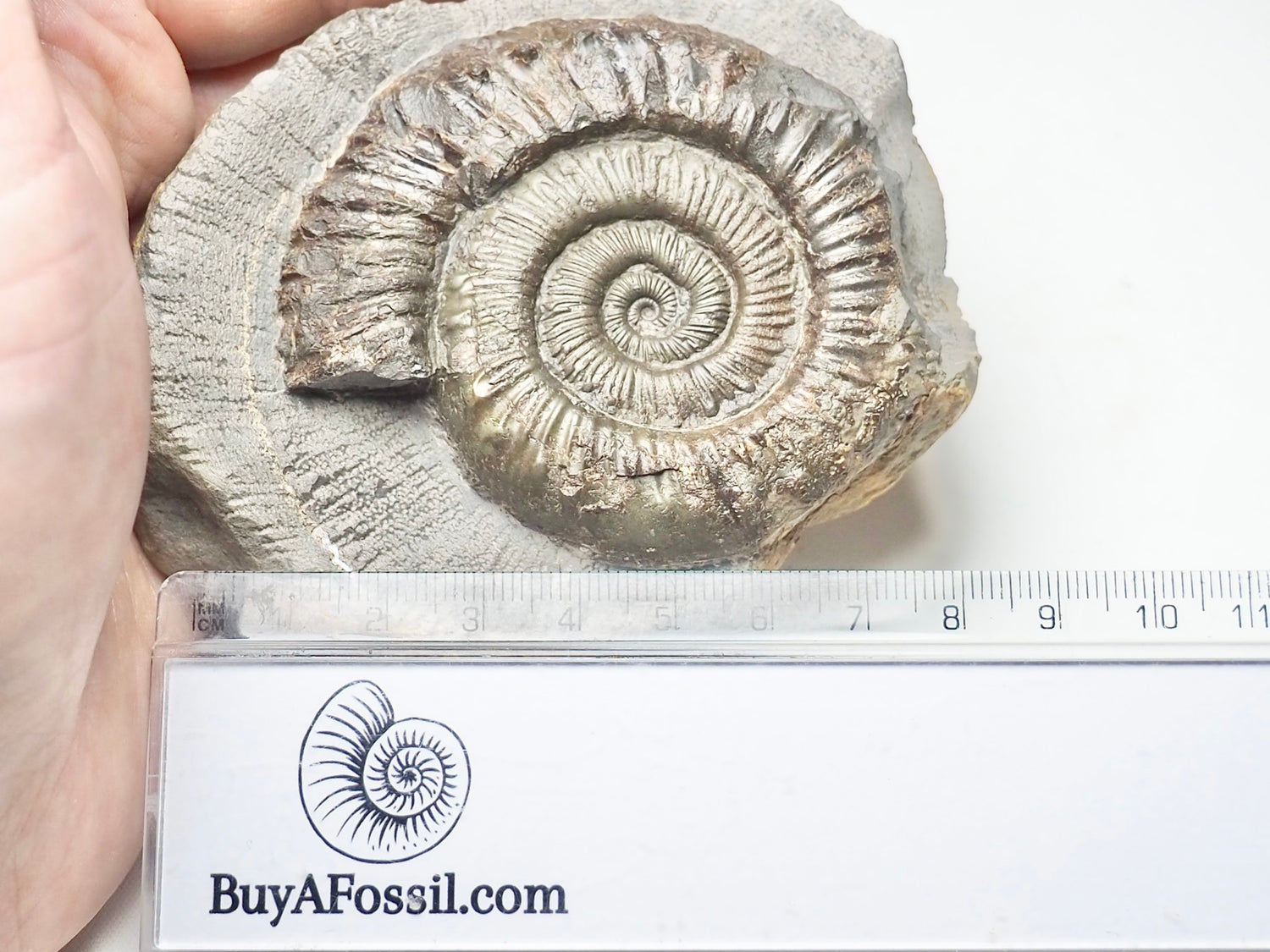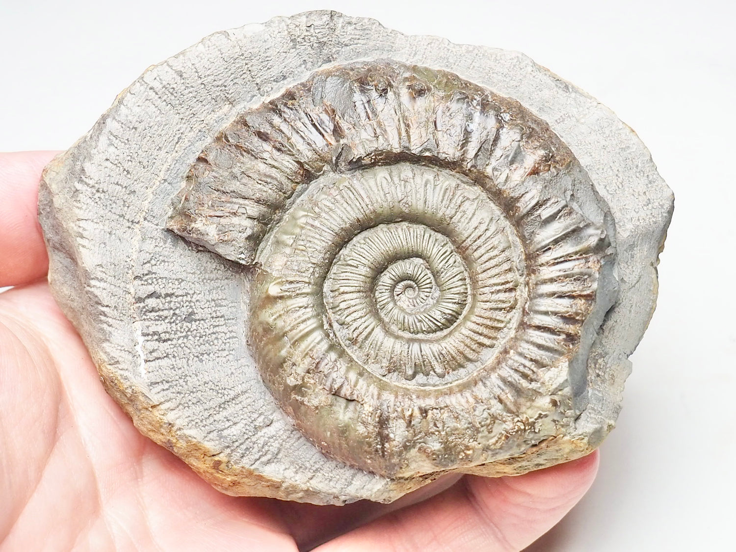 A Peronoceras ammonite fossil found near Whitby on the Yorkshire Coast. This species has little nodes or spikes. This example appears to have a slight pathology on the inner whorls.