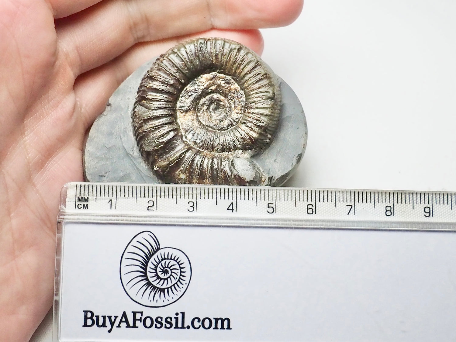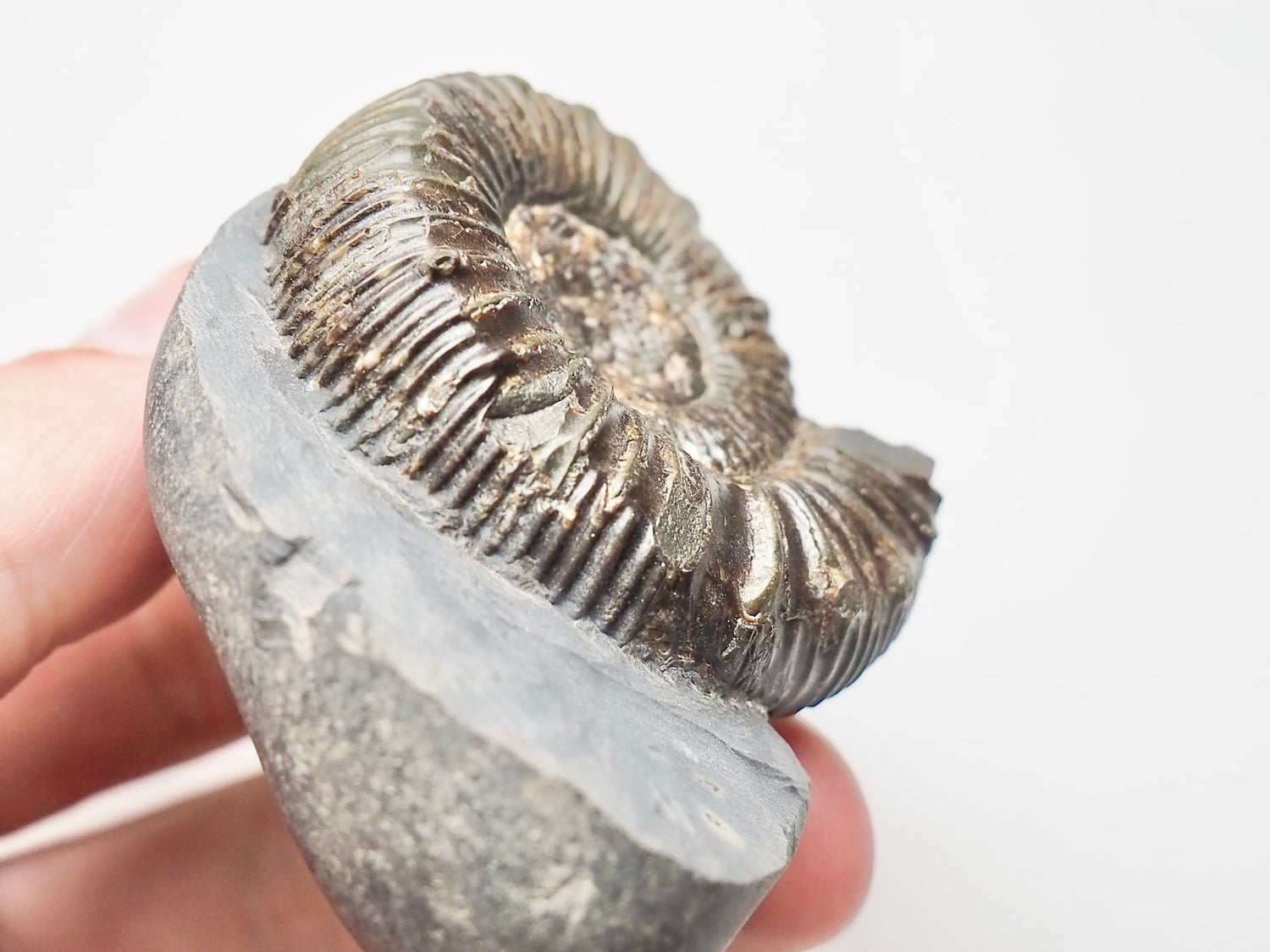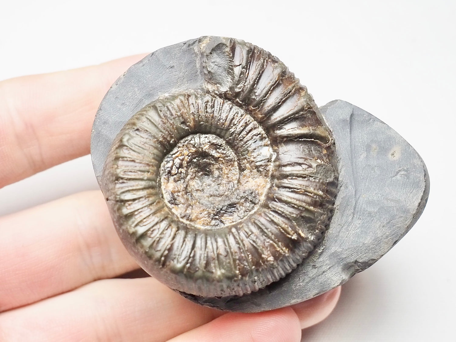 A Peronoceras ammonite fossil found near Whitby on the Yorkshire Coast. This species has little nodes or spikes.