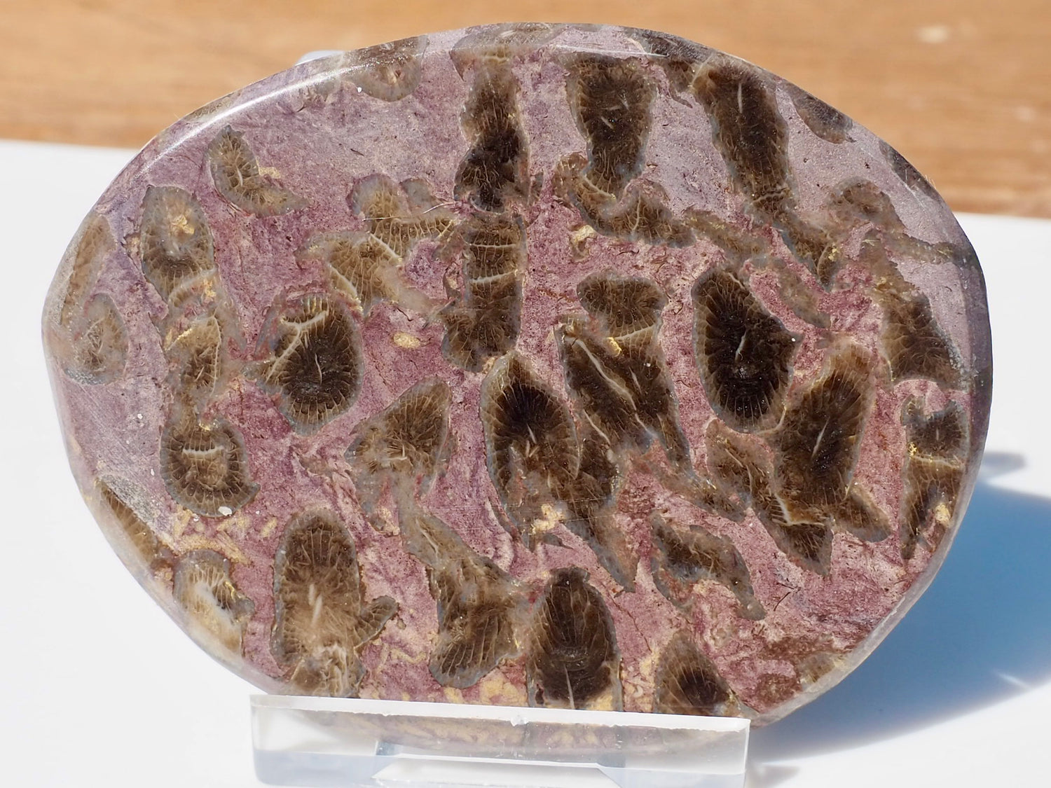 A vibrant piece of fossilized coral, sliced in half to reveal a stunning cross-section with intricate natural patterns and vivid coloration.