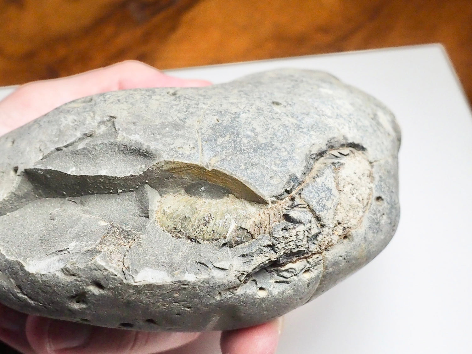 To reveal the fossil inside, the nodule will need to be prepared using fossil preparation tools such as air scribes (air tools) or carefully split with a hammer and chisel.