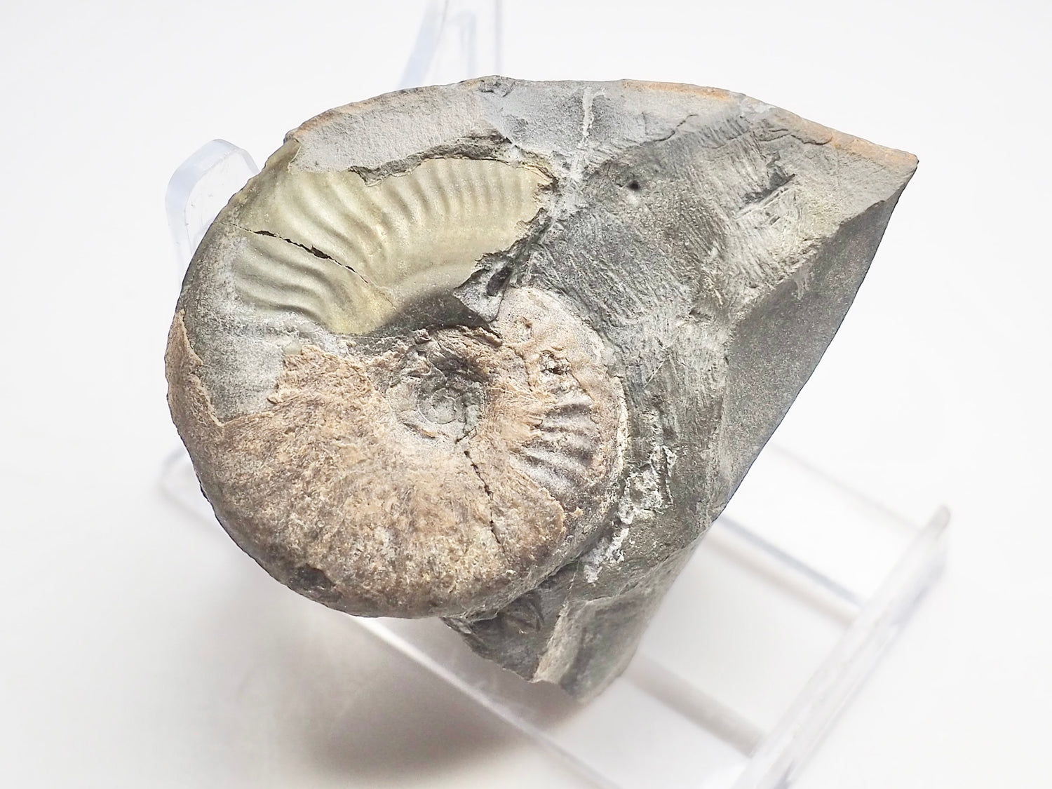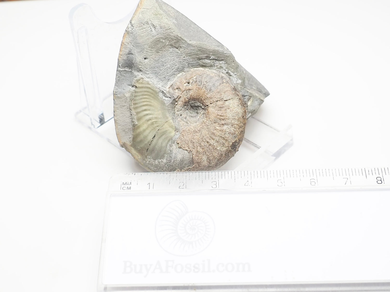 A well preserved eleganticeras ammonite piece fossil found near Whitby on the Yorkshire Coast.