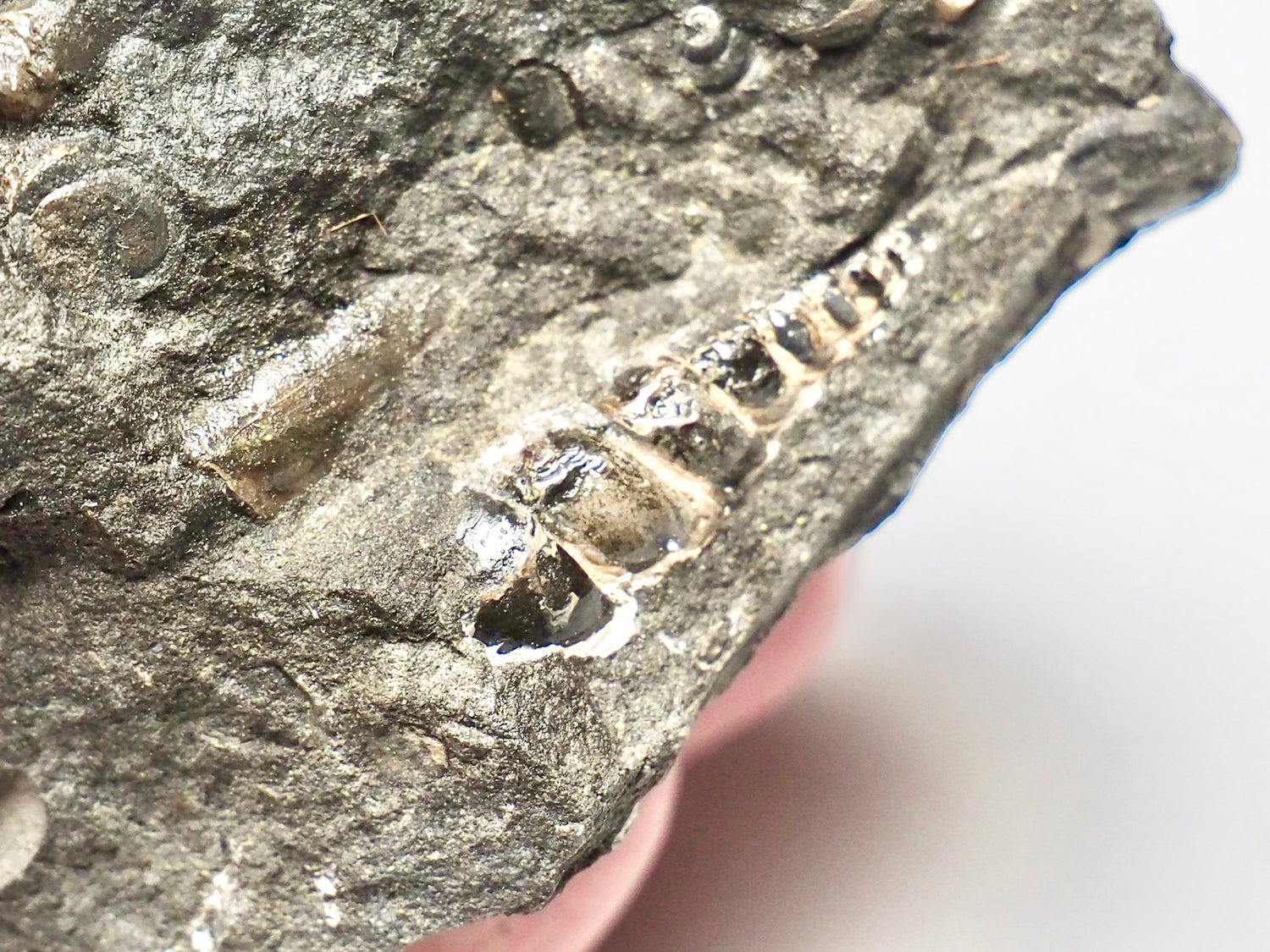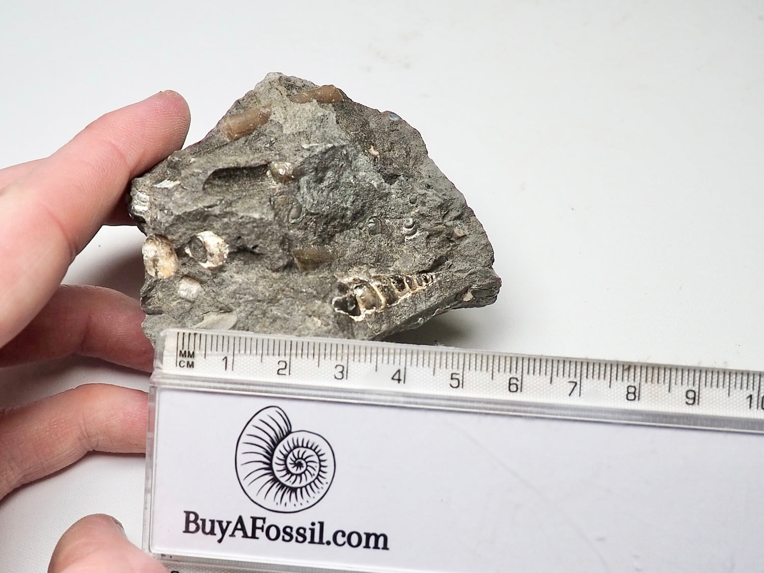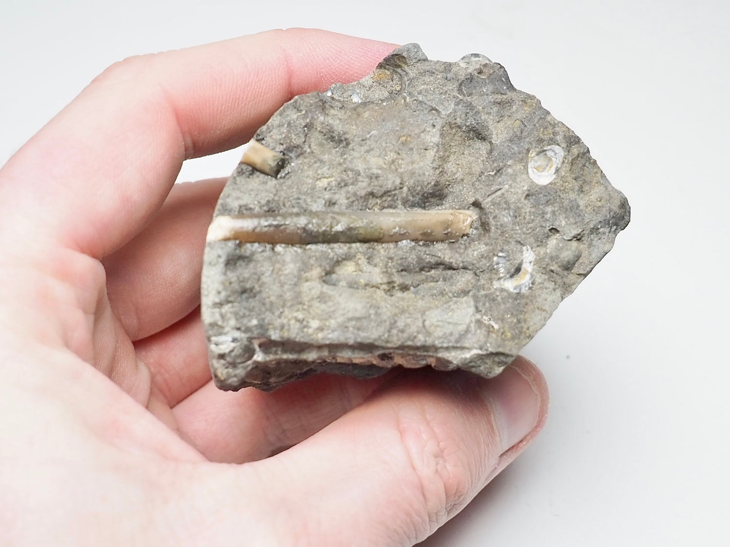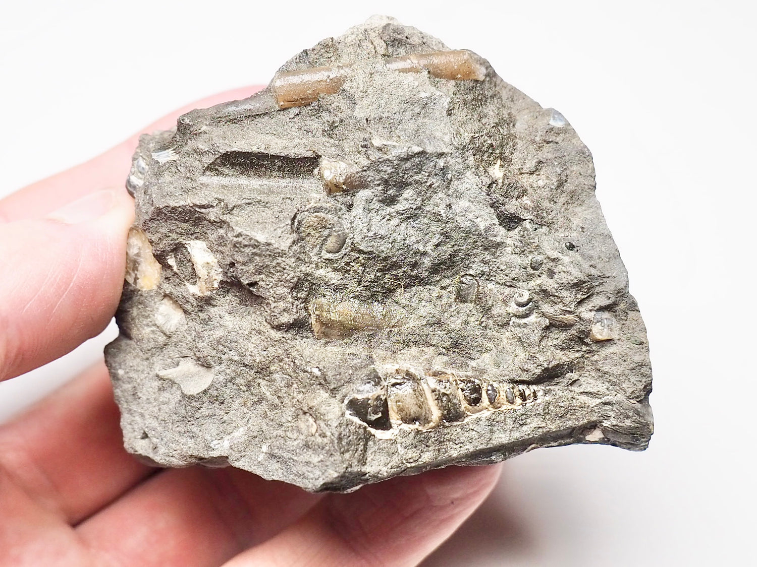 A wonderful fossil Gastropod found near Whitby on the Yorkshire Coast. The poiece also has some belemnites near it.