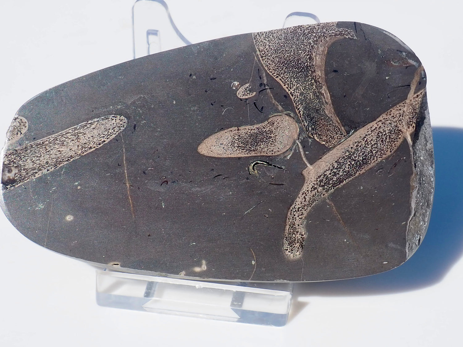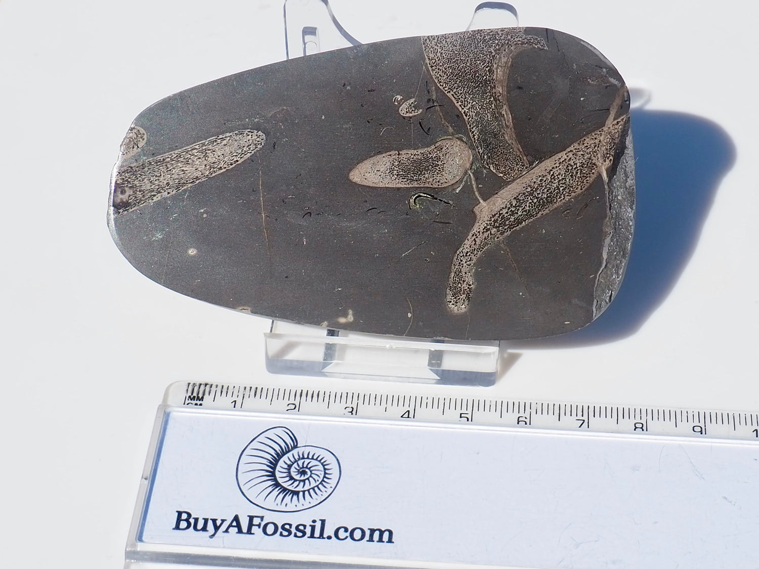 Ichthyosaur Bones Cut & Polished to a very high standard. A very interesting piece. Notice the black speckles inbetween the bone? This looks like the remains of it's last meal.