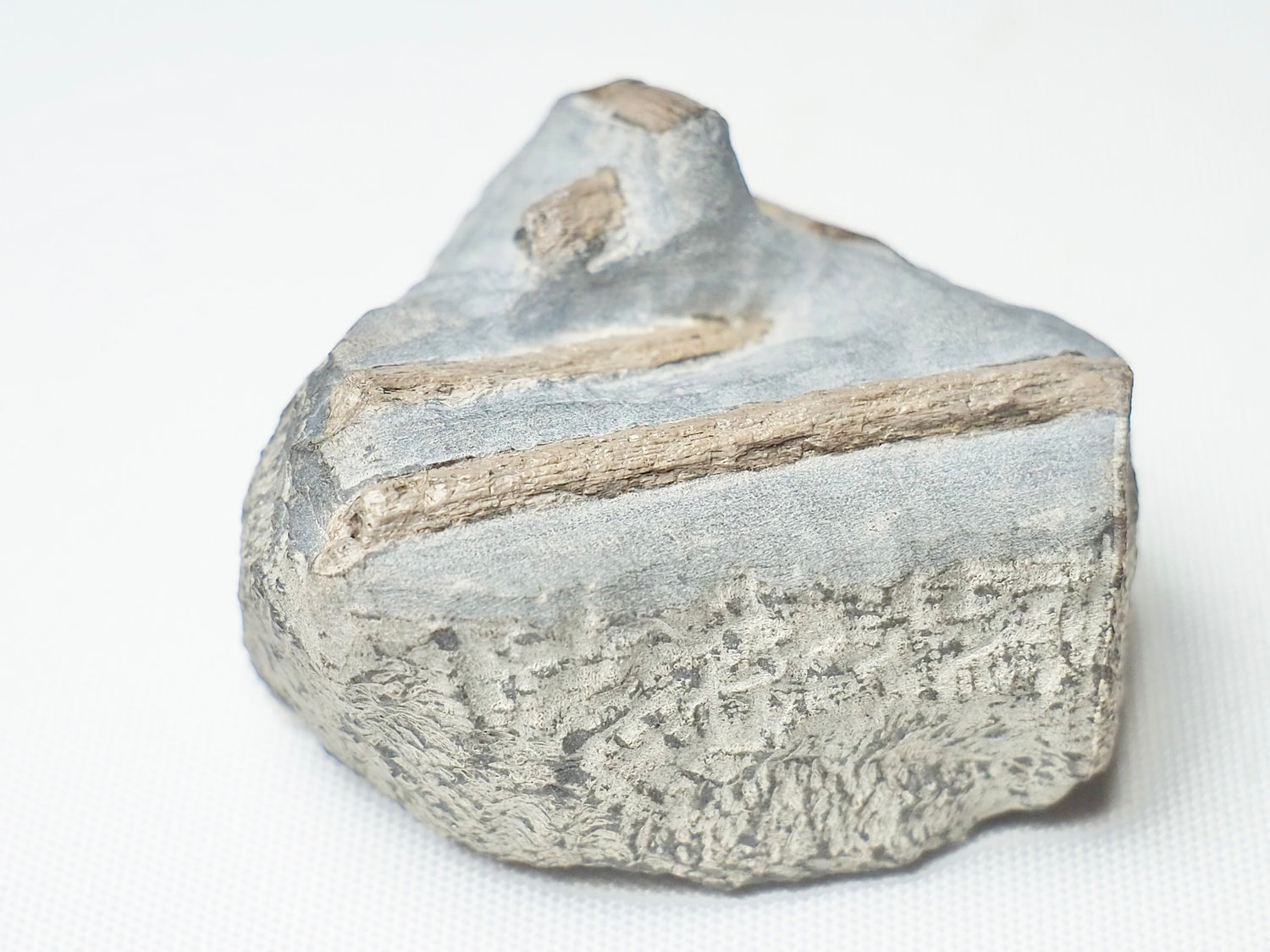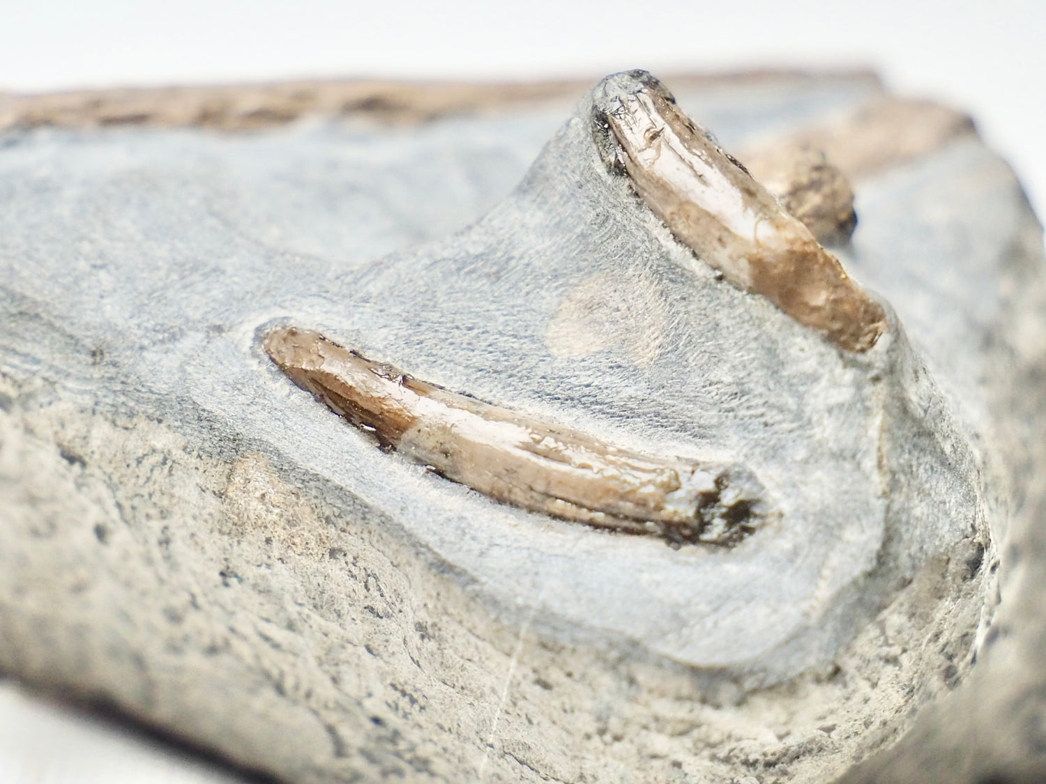A well prepared fossil specimen featuring two ichthyosaur teeth along with a partial rib.