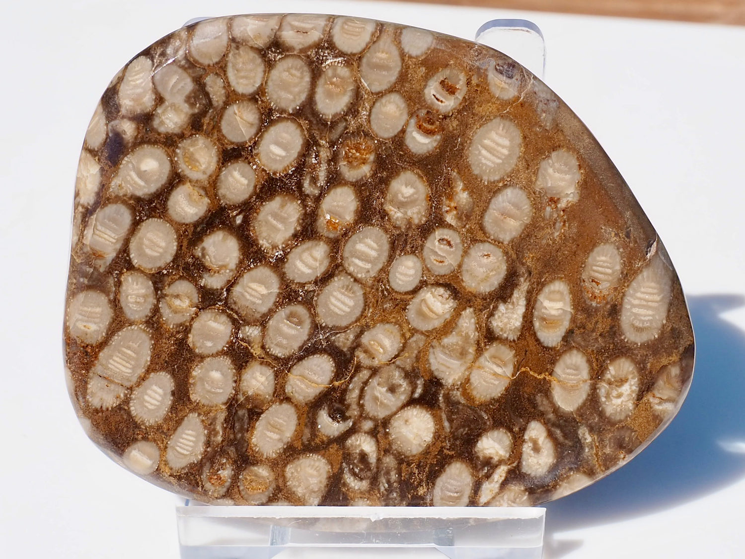 A vibrant piece of fossilized coral, sliced in half to reveal a stunning cross-section with intricate natural patterns and vivid coloration. Both sides have been polished on this example.