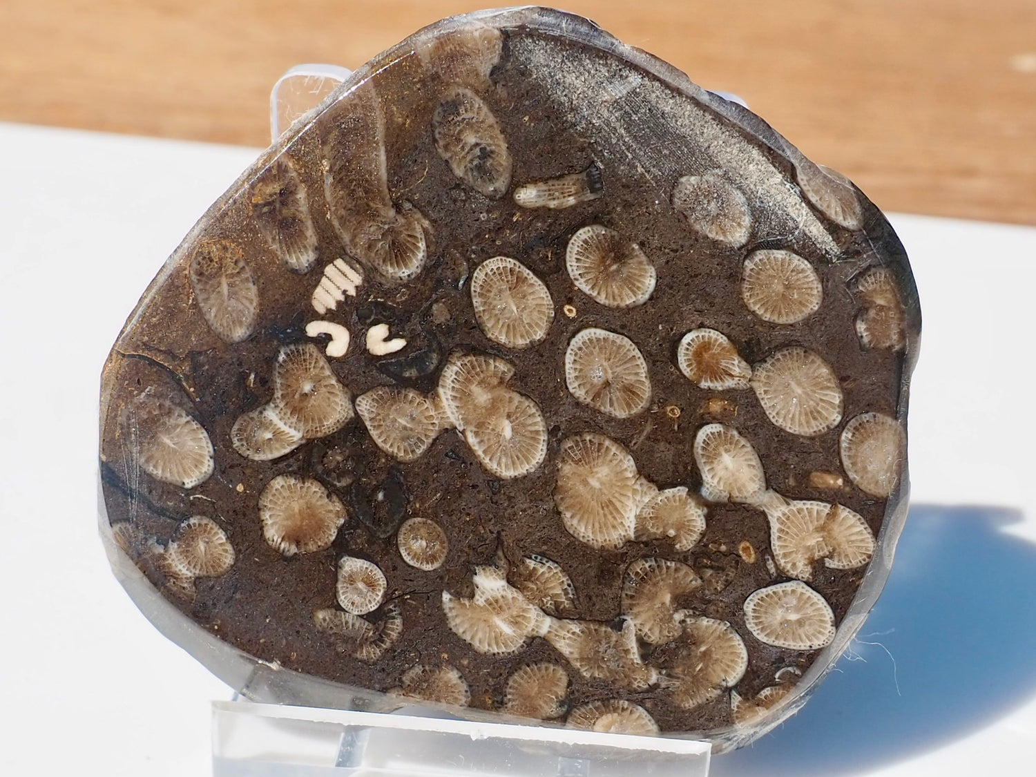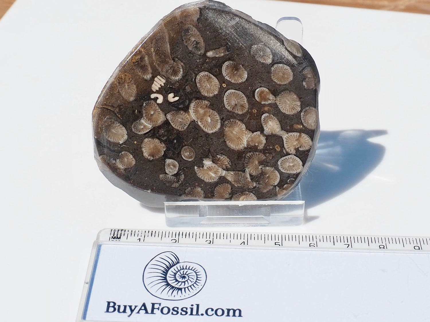 A vibrant piece of fossilized coral, sliced in half to reveal a stunning cross-section with intricate natural patterns and vivid coloration.